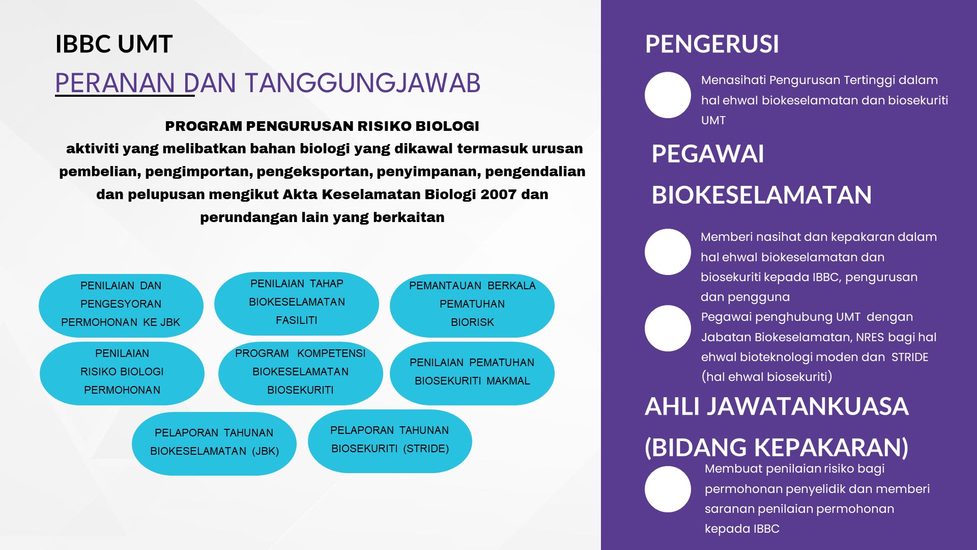 Mengurus risiko yang berkaitan dengan agen biologi dan biotoksin yang mungkin boleh membahayakan kesihAatan manusia, alam sekitar atau keselamatan.